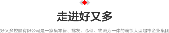 好又多控股有限公司 是一家集零售、批發、倉儲、物流為一體的連鎖大型超市企業集團,公司由數家面積大小不一的小型標超逐步發展壯大起來,經過近幾年的突飛猛進的發展,現擁有直營門店50家,大型賣場70家,加盟店2000余家。